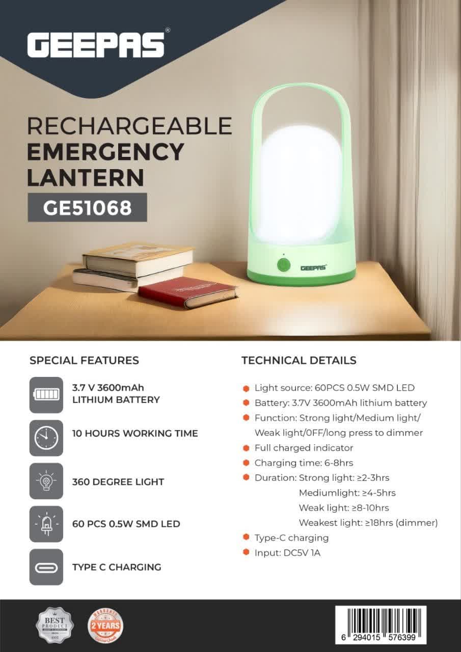GE51068👇منبع نور: 60 عدد SMD LED با توان 0.5 واتباتری: لیتیومی 3.7 ولت با ظرفیت 3600 میلیآمپر ساعتحالتهای نور: نور قوی، نور متوسط، نور ضعیف، خاموش + قابلیت کاهش شدت نور با نگه داشتن دکمهنشانگر شارژ کاملزمان شارژ کامل: 6 تا 8 ساعتمدت زمان روشنایی:نور قوی: 2 تا 3 ساعتنور متوسط: 4 تا 5 ساعتنور ضعیف: 8 تا 10 ساعتضعیفترین حالت (دیمر): بیش از 18 ساعتپورت شارژ: Type-Cورودی شارژ: DC 5V/1Aویژگیها: نوردهی ۳۶۰ درجه، سبک و قابل حمل، مناسب استفاده در منزل، کمپینگ و شرایط اضطراری