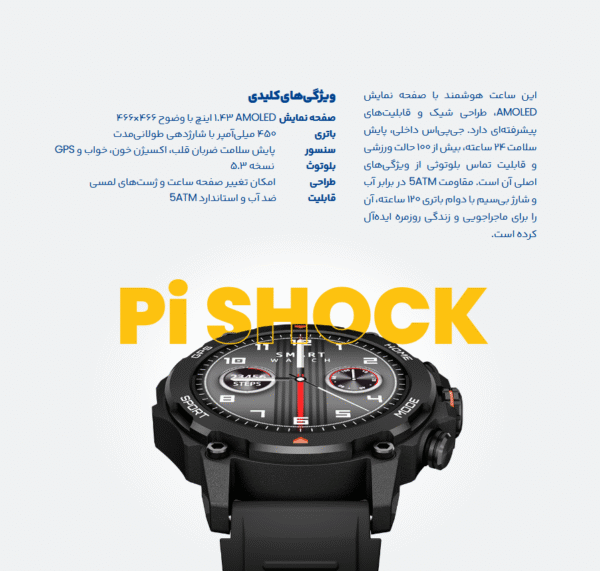 ساعت هوشمند HIMI GPS WATCH Pi Shock با طراحی مدرن و مقاوم، برای علاقهمندان به ورزش و فعالیتهای روزمره گزینه بسیار مناسبی است. این ساعت به GPS داخلی مجهز است که به شما امکان میدهد مسیر، سرعت و مسافت را بدون نیاز به گوشی موبایل ردیابی کنید.این مدل با حسگرهای مختلفی مانند ضربان قلب، اکسیژن خون (SpO2)، فشارسنج، پایش استرس و پایش خواب ، به شما کمک میکند تا سلامت خود را به دقت زیر نظر داشته باشید. همچنین، دارای بیش از ۱۰۰ حالت ورزشی است و با وجود میکروفون و اسپیکر داخلی، از قابلیت مکالمه بلوتوثی نیز پشتیبانی میکند. صفحه نمایش آن AMOLED است و بدنه آن با شیشه مقاوم و طراحی مستحکم، در برابر ضربه و نفوذ آب (5ATM) مقاومت خوبی دارد و برای استفاده در شرایط سخت طراحی شده است.