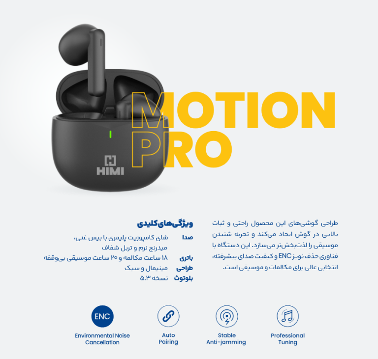 ایرپاد HIMI Motion Pro یک هدفون بیسیم (TWS) پیشرفته است که برای ارائه صدای باکیفیت و عملکردی قابل اعتماد طراحی شده است.کیفیت صدا و اتصال: این ایرپاد به بلوتوث نسخه ۵.۳ مجهز است که یک اتصال پایدار، سریع و کممصرف را تضمین میکند.عمر باتری: این مدل با باتری ۲۳۰ میلی آمپر ساعتی برای استفاده طولانیمدت طراحی شده و عمر باتری آن به همراه کیس شارژ ۲۰ ساعت پخش موسیقی و ۱۸ ساعت مکالمه مناسب است. کیس شارژ آن از طریق پورت USB-C شارژ میشود.قابلیتهای ویژه: دارای قابلیت حذف نویز محیطی (ENC) و قابلیتهایی نظیر کنترلهای لمسی برای مدیریت آسان تماسها و موسیقی باشد. همچنین، طراحی ارگونومیک و سیلیکونی آن، قرارگیری راحت و ایمن در گوش را تضمین میکند.این ایرپاد یک گزینه مناسب برای مکالمه، ورزش و گوش دادن روزانه به موسیقی با تمرکز بر کیفیت و دوام است.گارانتی ۶ ماهه بی قید و شرط تعویض