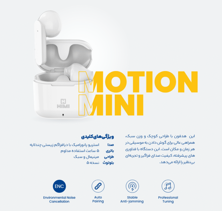 ایرپاد HIMI Motion Mini یک هدفون بیسیم (TWS) با طراحی بسیار کوچک، سبک و جمعوجور است که با هدف قابلیت حمل آسان و استفاده روزمره طراحی شده است.طراحی و ارگونومی: تمرکز اصلی این مدل بر اندازه کوچک و راحتی در گوش است تا برای استفادههای طولانیمدت یا هنگام فعالیتهای سبک مناسب باشد.اتصال: از طریق بلوتوث(نسخه ۵) به دستگاههای هوشمند متصل میشود و اتصالی پایدار برای پخش موسیقی و مکالمه فراهم میآورد.عمر باتری: علیرغم اندازه کوچک، باتری آن برای ۶ ساعت پخش مداوم موسیقی مناسب است و کیس شارژ آن نیز چندین بار امکان شارژ مجدد را فراهم میکند.(۱۶ساعت مکالمه، ۱۸ساعت پخش موسیقی)کاربرد: این ایرپاد یک گزینه اقتصادی و کاربردی برای کسانی است که به دنبال یک هدفون بیسیم با حداقل اندازه و وزن برای مکالمه و گوش دادن به موسیقی هستند.گارانتی ۶ ماهه بی قید و شرط تعویض