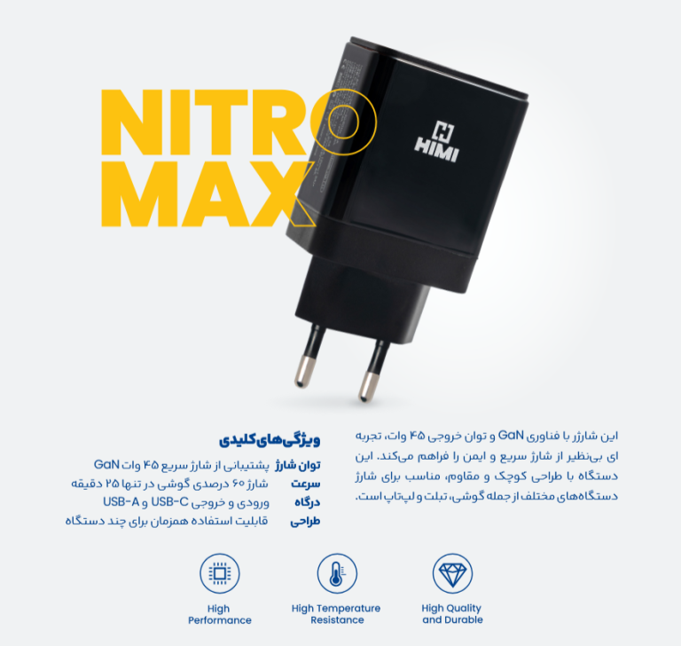 دو پورت خروجی USB-A + Type-Cتوان شارژ ۴۵ واتشارژ همزمان دو دستگاهمقاوم در برابر دمای بالاطراحی مینیمال و شیکوزن سبک به لطف فناوری GAN شارژ❌فناوری GAN Charge: بر خلاف شارژر های عادی که برپایه مواد سیلیکونی هستند و ضرفیت دمایی آن ها ۱۰۰درجه است ، شارژر های هیمی از عناصر گالیم و نیترید ساخته شده و ضرفیت دمایی آنها بیشتر از ۳۰۰ درجه است و به همین دلیل ابعاد بسیار کوچکی دارند و ولتاژ با ثبات تری رو به نسبت دیگر شارژ ها به شما ارائه میدهند.❌گارانتی ۶ ماهه بی قید شرط تعویض کالا✅✅✅