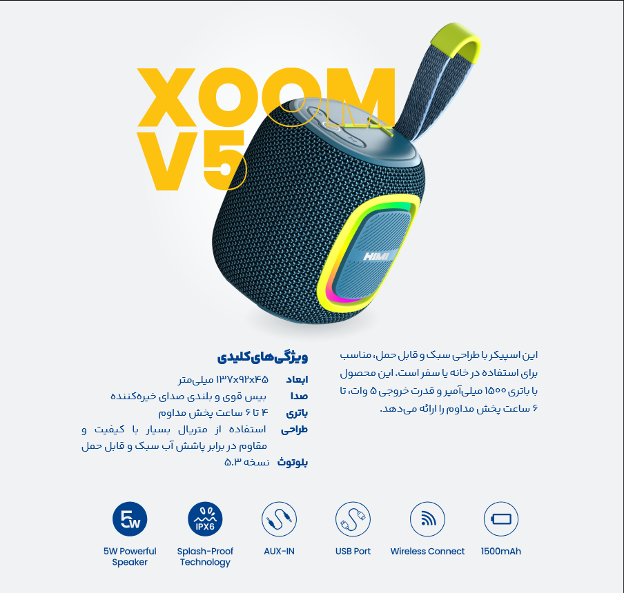 اسپیکر قابل حمل HIMI Xoom V5 یک بلندگوی بلوتوثی بسیار کوچک و سبک است که با تمرکز بر حملپذیری آسان و استفاده شخصی طراحی شده است.طراحی: این مدل دارای ابعاد بسیار کوچک و وزن کم است که به راحتی در کیف جای میگیرد و برای مسافرتهای کوتاه یا محیط کار عالی است.عملکرد: با توان خروجی ۵ وات صدای واضح و قابل قبولی برای گوش دادن به موسیقی یا پادکست به صورت انفرادی یا در فضاهای کوچک ارائه میدهد.اتصالات: از اتصال بلوتوث (نسخه ۵.۳) برای پخش بیسیم پشتیبانی میکند و دارای شکاف کارت حافظه (MicroSD) برای پخش مستقیم موسیقی باشد.باتری: مجهز به باتری داخلی با ظرفیت ۱۵۰۰ میلی آمپر ساعت است که برای ۴ تا ۶ ساعت پخش مداوم موسیقی کافی است.این اسپیکر برای کاربرانی که به یک بلندگوی فوقالعاده قابل حمل و با قیمت اقتصادی برای استفاده شخصی نیاز دارند، مناسب است.به همراه گارانتی ۶ ماهه بی قید و شرط تعویض پارس نوین مدیا که خیال شمارا از خرید محصولات هیمی آسوده میکنه.