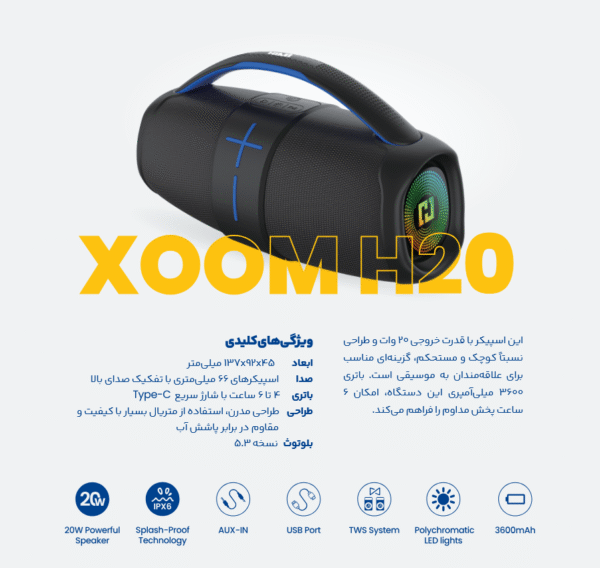 اسپیکر قابل حمل HIMI Xoom H20 یک بلندگوی بلوتوثی قدرتمند و با اندازه متوسط است که تعادلی بین کیفیت صدا، قابلیت حمل و توان خروجی ایجاد کرده است.توان صوتی: این اسپیکر معمولاً توان خروجی بالاتری نسبت به مدلهای کوچکتر سری V ارائه میدهد که برای پوشش دادن یک اتاق بزرگ یا استفاده در محیط باز کوچک مناسب است.کیفیت صدا: با بهرهگیری از درایورهای صوتی باکیفیت، صدایی شفاف با بیس قابل قبول و کوبنده را ارائه میدهد.قابلیت حمل: طراحی آن به گونهای است که به راحتی قابل حمل باشد و اغلب دارای دستگیره برای جابجایی آسان است.باتری: مجهز به باتری داخلی با ظرفیت خوب برای پخش ۶ ساعته موسیقی بدون نیاز به شارژ است.اتصالات: از اتصال بلوتوث پشتیبانی میکند و ممکن است دارای ورودیهای AUX، USB و MicroSD برای تنوع در پخش موسیقی باشد.این اسپیکر یک انتخاب عالی برای مهمانیهای کوچک، پیکنیکها و کسانی است که به دنبال صدای بلند و واضح با قابلیت حمل بالا هستند.